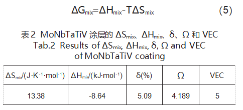 MoNbTaTiV难熔高熵合金涂层的ΔHmix、δ、Ω及VEC的结果见表2。可看出,这些参数的值都符合单一BCC固溶体形成的条件。为进一步判断是否形成简单固溶体相还需要计算合金体系中固溶体的形成自由能。为了简化计算,根据Takeuchi和Inoue的假设,在组分一定的合金中自由能变化(ΔG)与其液态下的混合自由能变化(ΔGmix)成线性比例关系[18]。于是,合金体系中固溶体的形成自由能可由式(5)表达:
