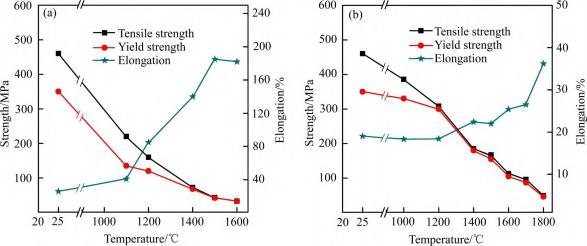 中等强度、中等塑性铌合金主要是以铌为基体,添加不超过10%(质量分数)的W、Mo、Ta、V、Ti、Zr、Hf等金属元素和少量的C元素组成,这类合金有C-129Y、SCb-291、D31、D43、FS85[6]、Cb-752[17−18]、PWC-11[19,22]、5ВНЦ[14,20]和Nb521[20−21]等。这些合金在室温下的强度为400-600MPa,断后伸长率为20%~30%;在1000-1400℃的高温下仍有相当高的强度并可以有效地工作。如果时间较短的话,工作温度可以更高。由于该类合金含有适量的W、Ta、Ti、Zr、Hf,所以再结晶温度提高到1150~1250℃。同时,由于该类合金的塑−脆性转变温度比纯铌高,焊接状态下的转变温度一般在室温以上,对O、N、H等间隙元素比较敏感,所以需要严格控制O、N、H的污染,合金中的氧含量必须控制在8×10−5(质量分数)以下。该类合金具有一定的塑性和较好的工艺性能,可用于制造各种零部件等,如蒙皮、螺栓和螺母等构件[5]。