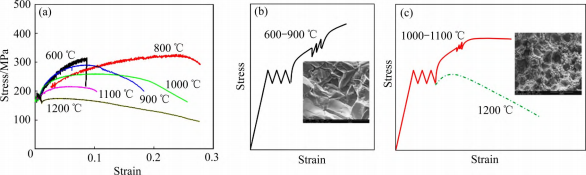 图3 不同温度下C-103 合金的应力-应变曲线和示意图[47]