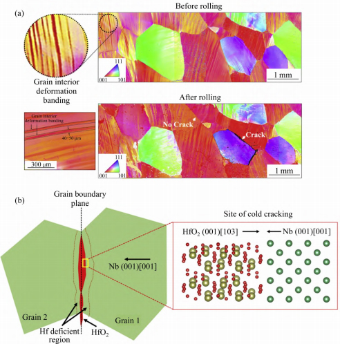 图4 C-103 合金冷变形前后的EBSD 反极图及Nb-HfO2 界面的示意图[49]