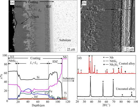 图5 C-103 合金硅化物涂层的显微组织和成分[51]