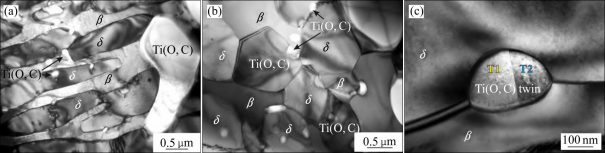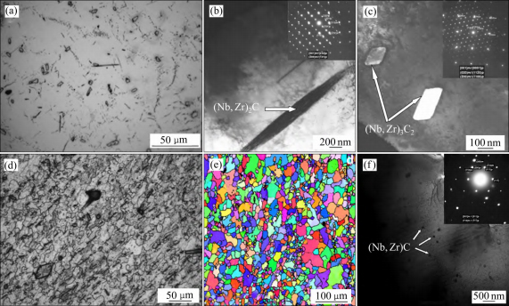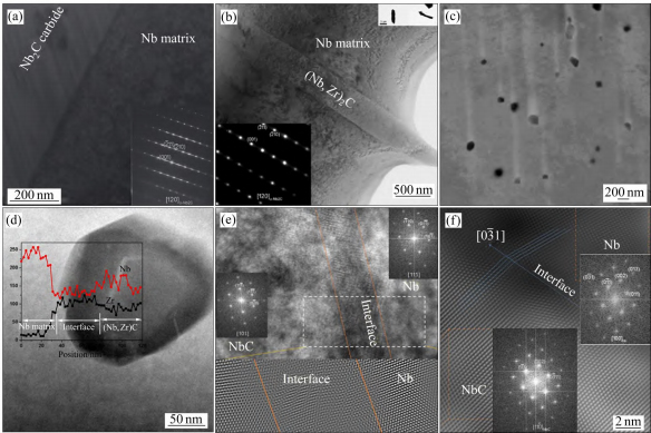 通常,铌合金的弥散强化是通过稳定、细小的碳化物、氧化物和氮化物进行强化,这种强化方式对于改善高温强度非常有效。张春基等[36,74]研究了Nb521合金碳化物强化相为弥散分布的(Nb,Zr)C、ZrC和Nb2C相,ZrC为弥散分布的稳定碳化物相,而Nb2C为亚稳碳化物相。夏明星等[75]研究了不同含量及尺寸的Nb2C颗粒对Nb-W-Mo-Zr-C铌合金组织和性能的影响,认为添加含量为0.4%(质量分数)及尺寸在5μm左右的Nb2C颗粒可以使合金的高温强度达到最高。