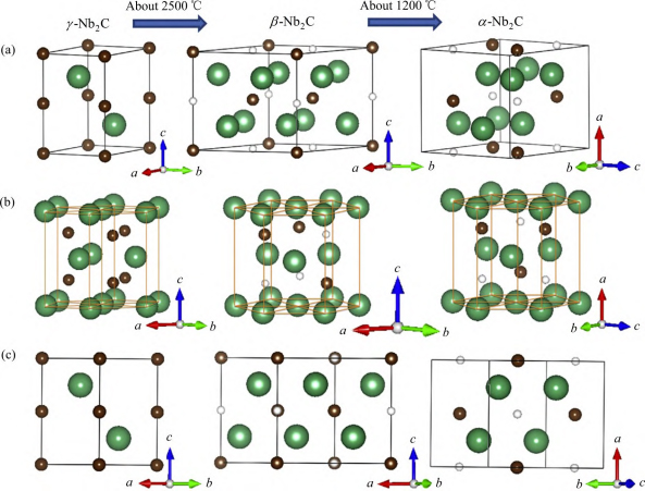该合金通过在Nb中加入Zr和C元素实现固溶强化和沉淀强化同时作用,以提高该合金的高温强度。因此,PWC-11合金的碳化物沉淀强化则备受关注。FARKAS等[57]通过热力学分析证实了Nb、C在热处理过程中向ZrC和NbC混合物的转变。自由能计算表明,在一定的时效温度下,混合碳化物颗粒中存在最大的NbC浓度。时效温度越高,颗粒中平衡态NbC含量越高。VISHWANADH等[58]对Nb-1Zr-0.1C合金铸态、挤压态和退火态的显微组织进行了研究。结果表明:铸态组织为两相组织,其中Nb2C析出相呈针状分布在基体中;挤压态试样中有两种类型的析出相(见图6(a)~(c)),一种是针状((Nb,Zr)2C,呈正交晶型结构;另一种是长方形((Nb,Zr)3C2,呈六角形结构);退火态的组织呈现平衡结构,即Nb基体及(Nb,Zr)C析出物(见图6(d)(f))。VISHWANADH等[59]又继续对Nb-1Zr-0.1C合金中γ-Nb2C的形成及其他Nb2C碳化物相(α,β)的相互关系进行了研究。结果表明,Nb向γ-Nb2C的转变是通过碳原子占据Nbbcc晶格中的八面体位置来实现的,而γ-Nb2C→β-Nb2C→α-Nb2C的相变顺序涉及空位的排列,而这三种结构的晶格基本相同(见图7)。通过晶格应变计算表明,由于碳原子占据八面体位置而产生的应变主要沿Nb2C晶格的[0001]方向产生,这种应变也有助于亚稳无序结构相γ-Nb2C相在较低温度下的溶解。为了进一步弄清楚Nb-1Zr-0.1C合金中各种碳化物的形成和Nb2C→NbC碳化物转变等问题,VISHWANADH等[60]采用两种方法制备试样(即凝固试样挤压+再结晶处理和凝固试样+热处理),通过研究发现,合金在凝固状态下中只含有α-Nb2C碳化物,当Zr在Nb基体和Nb2C相中均匀分布时,α-Nb2C保持稳定状态;当合金挤压或热处理时,Zr优先向α-Nb2C碳化物相扩散,使碳化物相失稳,在后续的退火处理中,以更稳定的(Nb,Zr)C相析出,其形态为球形或针状,具体与合金的热机械加工有关;如果析出相在再结晶前发生形核,且析出相的生长与再结晶同时发生,则呈球形且与基体相没有特定的取向关系。如果析出相在再结晶后或未再结晶的样品中发生形核和长大,则呈针状且与基体相遵循特定的取向关系(见图8)。