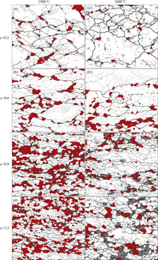 图9 应变速率为0.1 s-1 、温度分别为 1500 和 1600 ℃条件下不同真应变时的再结晶晶粒EBSD 图[62]