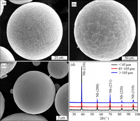 图 10 不同尺寸Nb521 合金粉末表面凝固形貌及XRD 谱[77]