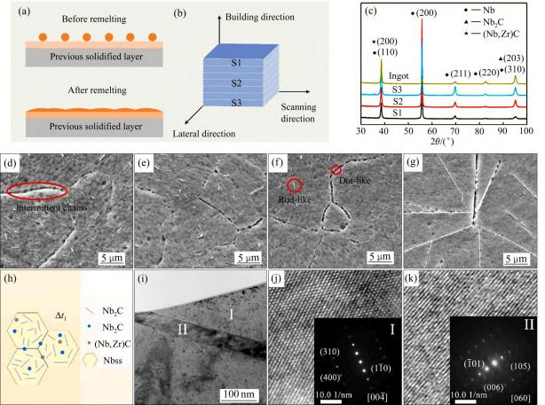 Nb521铌合金具有良好的室温成形性能,通常可以采用板材旋压制备均匀过渡的喷管延伸段,但大部分喷管都是采用棒材经过机加工获得,机加工难度较大而且材料利用率也比较低。因此,研究Nb521铌合金的近净成形和增材制造是提高该合金材料利用率的一种有效方法。ZHANG等[76]采用高能球磨机在室温下成功制备了纳米Nb521合金粉末并进行了相应的分析表征,结果表明球磨速度起决定性作用,当球磨速度达到450r/min时经过60h可以获得晶粒尺寸为14nm的纳米粉末。刘宝鹍[77]对等离子体旋转雾化法制备的Nb521合金粉末进行了研究,发现该方法制备的合金粉末多呈球形且球形度较高,大颗粒粉末表面较为粗糙,小尺寸颗粒粉末表面则比较光滑(见图10),其粒径分布符合标准正态分布;经XRD和纳米压痕实验分析,结果显示Nb521合金粉末中只存在Nb衍射峰,且随着粉末粒径的减小,合金粉末的纳米硬度以及最大载荷随之增加。YANG等[78]采用电子束选择性熔化(EBSM)法制备了Nb521合金,并对制备的试样与铸锭试样的显微组织特征进行了对比研究,如图11所示。结果表明:EBSM法制备的Nb521样品中,析出相含量从顶部到底部逐渐增加,而且不同形貌的点状或棒状析出相分布在晶粒内部或沿晶界分布,而在Nb521合金铸锭中则存在大长宽比的针状析出相。EBSM法制备的试样中,析出相主要为(Nb,Zr)C和Nb2C,且随着热平衡保温时间的延长,细长析出相部分破碎,晶粒变得细小均匀。