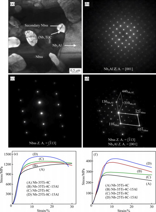 图 16 Nb-35Ti-4C-15Al 合金的TEM 显微组织及四种合金在室温和 1000 ℃的压缩应力-应变曲线[110]
