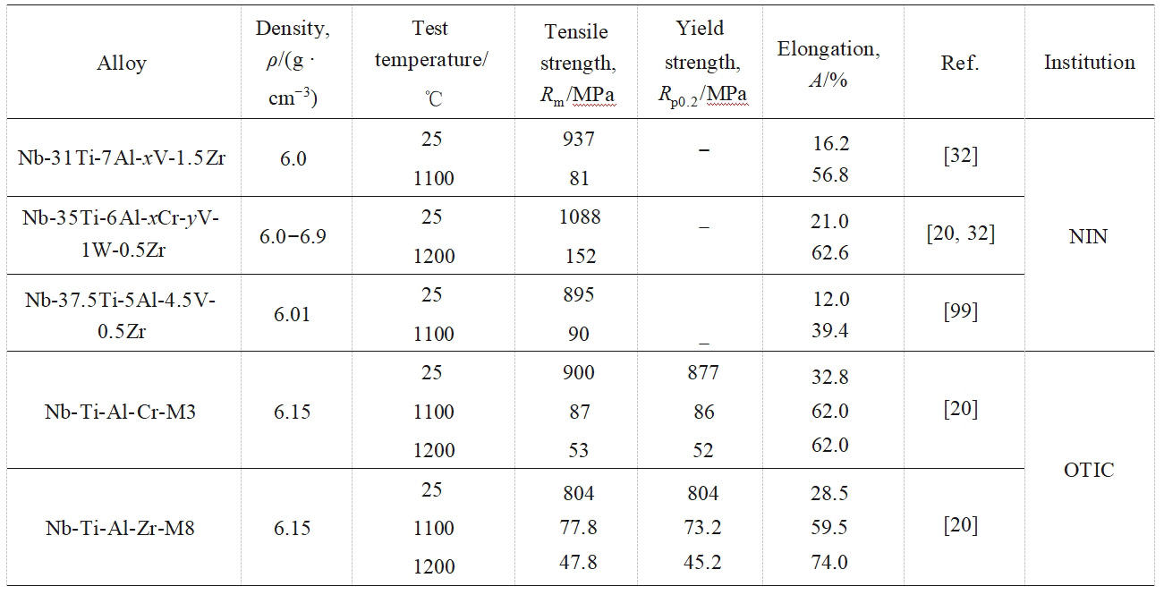 表5 国内部分低密度铌合金的拉伸性能及密度[20, 32, 99]