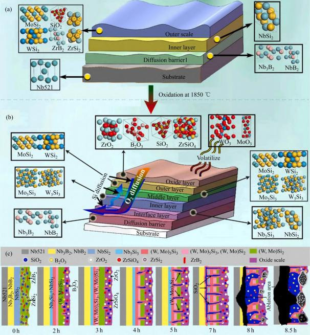 由于使用温度和高温力学性能的限制,C-103合金和硅化铌防氧化涂层已经难以满足航天器不断发展的需求。为此,我国在苏联5ΒΜЦ铌合金的基础上研制了Nb521(Nb-5W-2Mo-1Zr)铌合金。该合金采用了硅化钼高温防氧化保护涂层,使得工作温度提高到了1550℃左右,显著减少了冷却燃烧室推进剂所用的流量,从而有效地提升了发动机的比冲,成为我国目前轨道控制/姿态控制发动机难熔(MM)涂层、WSi2和莫来石共同改性MoSi2(WMM)涂层及其抗氧化性能进行了研究,发现添加10%(质量分数)莫来石的MM涂层抗氧化性能非常好,而WMM涂层的抗氧化性能更优,在1500℃有效保护时间(500h)至少是MoSi2单一涂层(175h)和MM(346h)涂层的2.8倍和1.5倍(见图12)。为了进一步开发适用于更高温度的超高温铌合金涂层,ZHANG等[84]采用新颖的三步法制备了10%ZrB2+5%YSZ改性的具有硼化物扩散阻挡层的Si-Mo-18%W涂层,研究发现NbB2-Nb3B2扩散势垒的涂层可以有效地保护Nb521合金在1850℃达到8h以上(见图13),而没有扩散阻挡层的涂层寿命只有3.5h。涂层性能优越的贡献主要是由于扩散阻挡层和形成自愈的SiO2-B2O3-ZrSiO4-ZrO2氧化垢,扩散阻挡层能有效地阻止涂层与基体的相互扩散,可以降低硅元素的内向消耗,从而提高涂层的寿命。