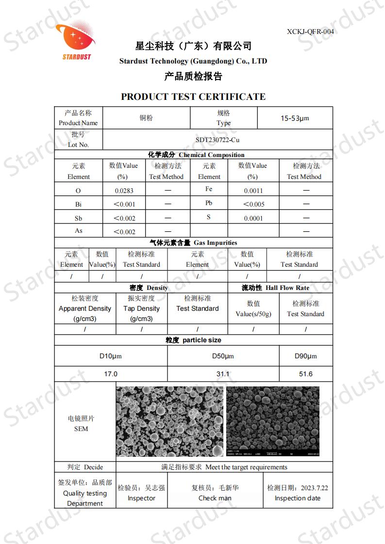 纯度:通过合适的制备方法,可获得较高纯度的球形铜粉,杂质(如铁、锌、铅等)含量较低,保证了其良好的导电、导热等性能。