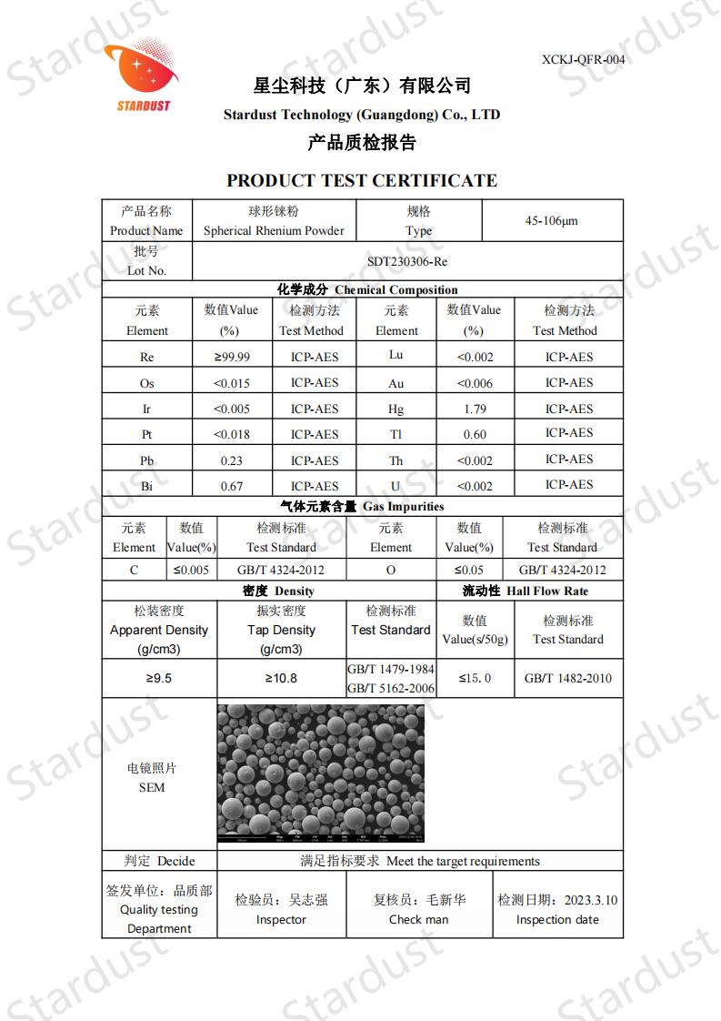 纯度:由于射频等离子体球化制备过程的高纯环境,铼粉纯度较高,杂质(如氧、氮、碳、重金属等)含量低,保障了铼粉性能的稳定性和可靠性。