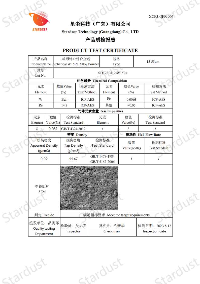 球形W-15Re合金粉末是一种由钨(W)和铼(Re)组成的合金粉末,具有独特的性能,适用于多种高端应用。