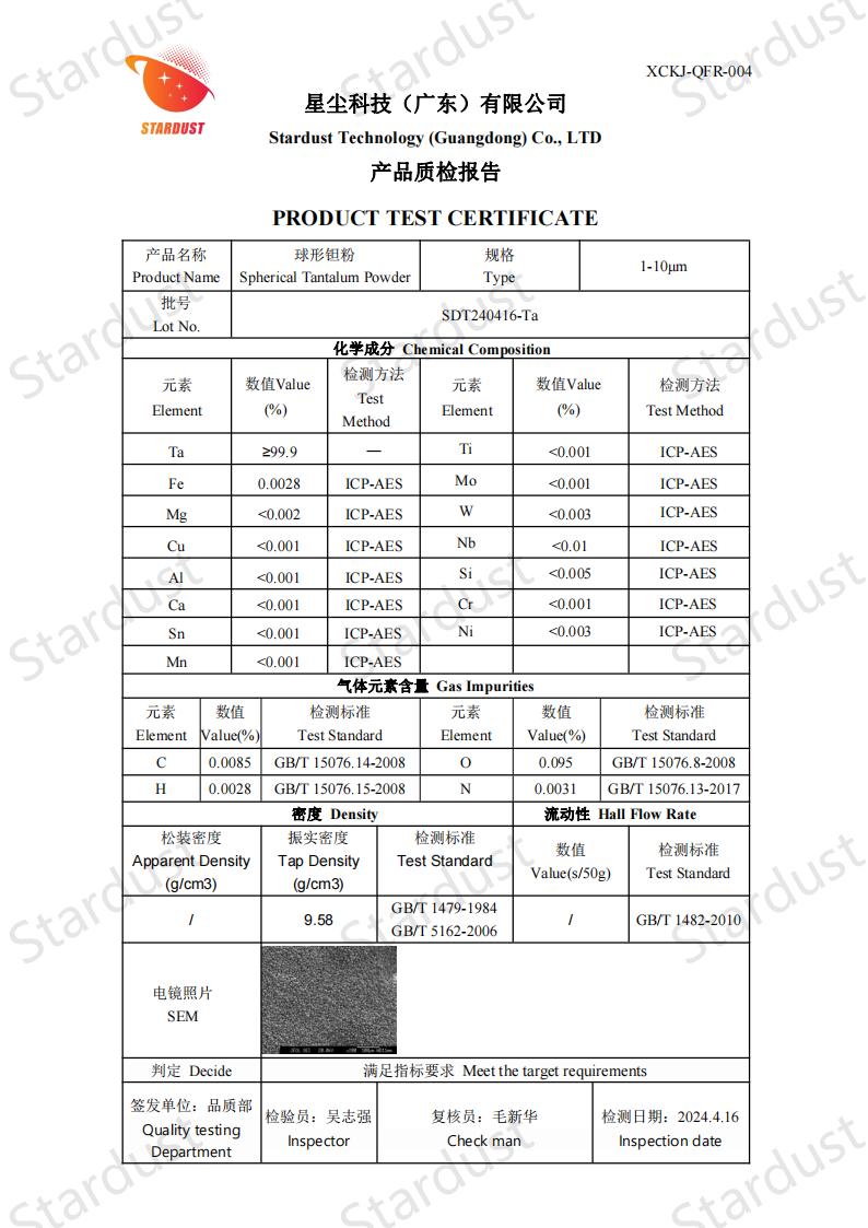 球形钽粉采用射频等离子体球化技术制备,具有高纯度、含氧量低、球形度高、表面光滑、无卫星、粒度分布均匀、流动性能优异、松装密度和振实密度高等特点。