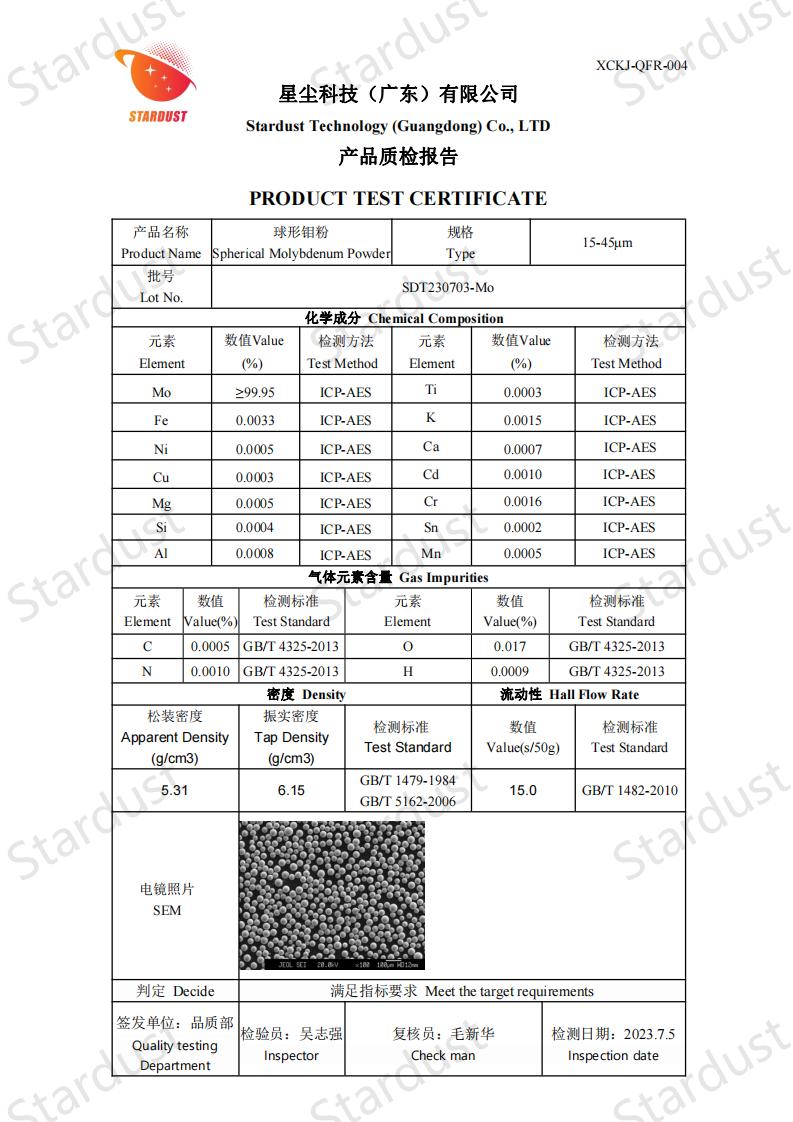 球形钼粉采用射频等离子体球化技术制造,具有高纯度、含氧量低、球形度高、表面光滑、无卫星、粒度分布均匀、流动性能优异、松装密度和振实密度高等特点。