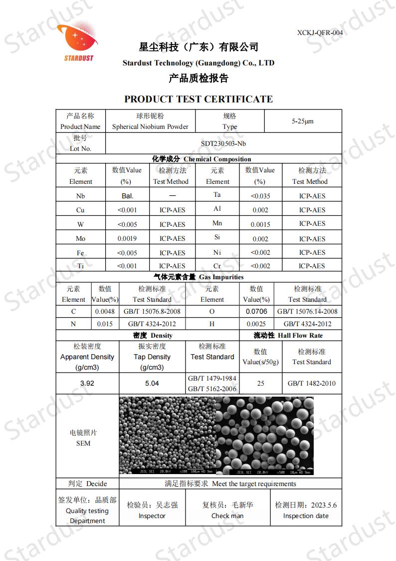纯度:在射频等离子体球化制备过程中,有效减少了杂质的引入,纯度较高,杂质元素(如氧、碳、氮等)含量较低,保证了铌粉的质量和性能稳定性。