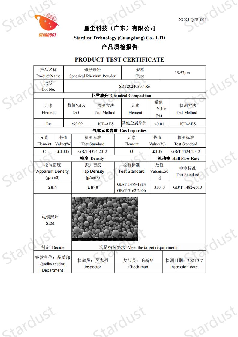 纯度:由于射频等离子体球化制备过程的高纯环境,铼粉纯度较高,杂质(如氧、氮、碳、重金属等)含量低,保障了铼粉性能的稳定性和可靠性。