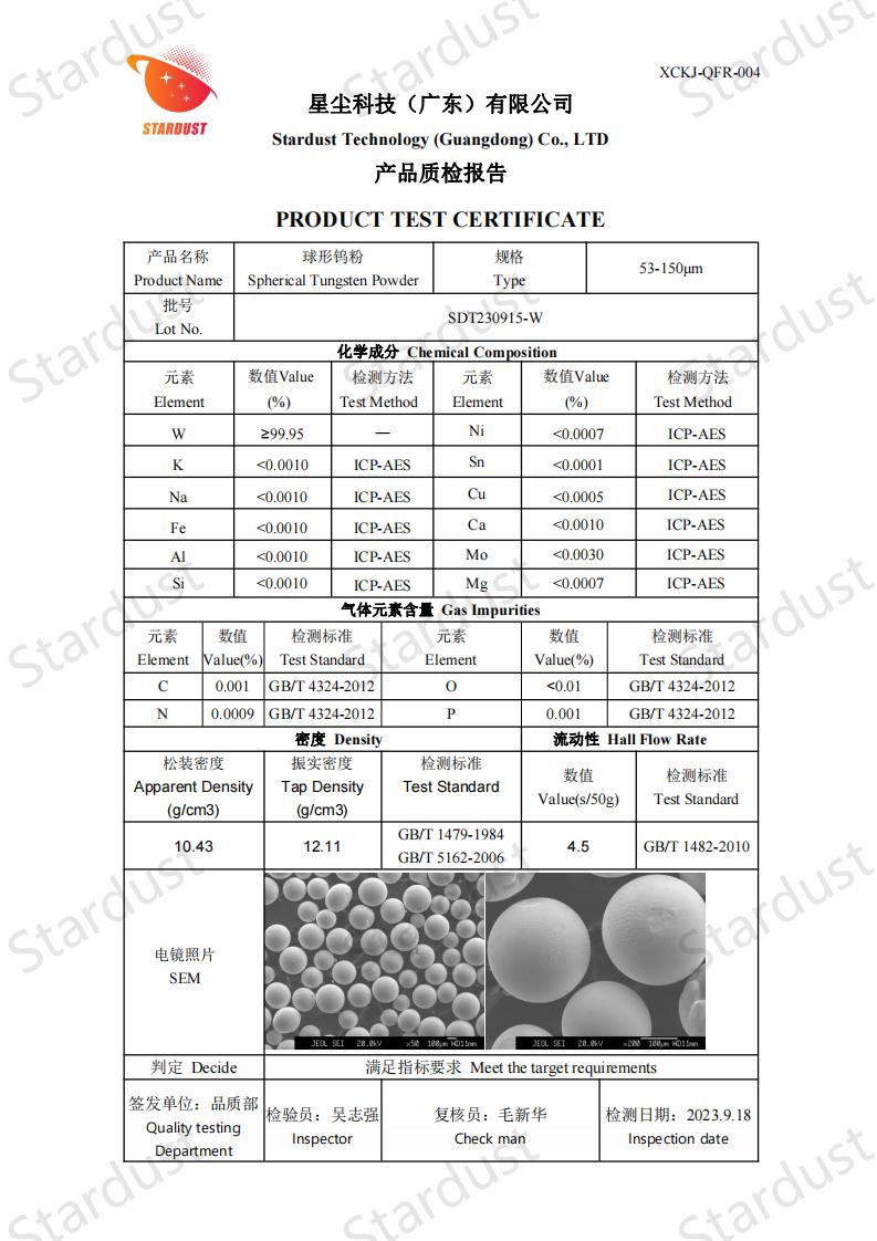 球形钨粉采用射频等离子体球化技术制造,具有高纯度、含氧量低、球形度高、表面光滑、无卫星、粒度分布均匀、流动性能优异、松装密度和振实密度高等特点。